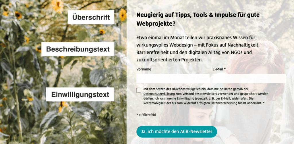 - Inhalte und Versandhäufigkeit klar kommunizieren: Kommuniziert klar, welche Inhalte und wie häufig eure Leser:innen Post von euch bekommen – z. B. „Ihr erhaltet einmal im Monat Tipps rund um XY.“