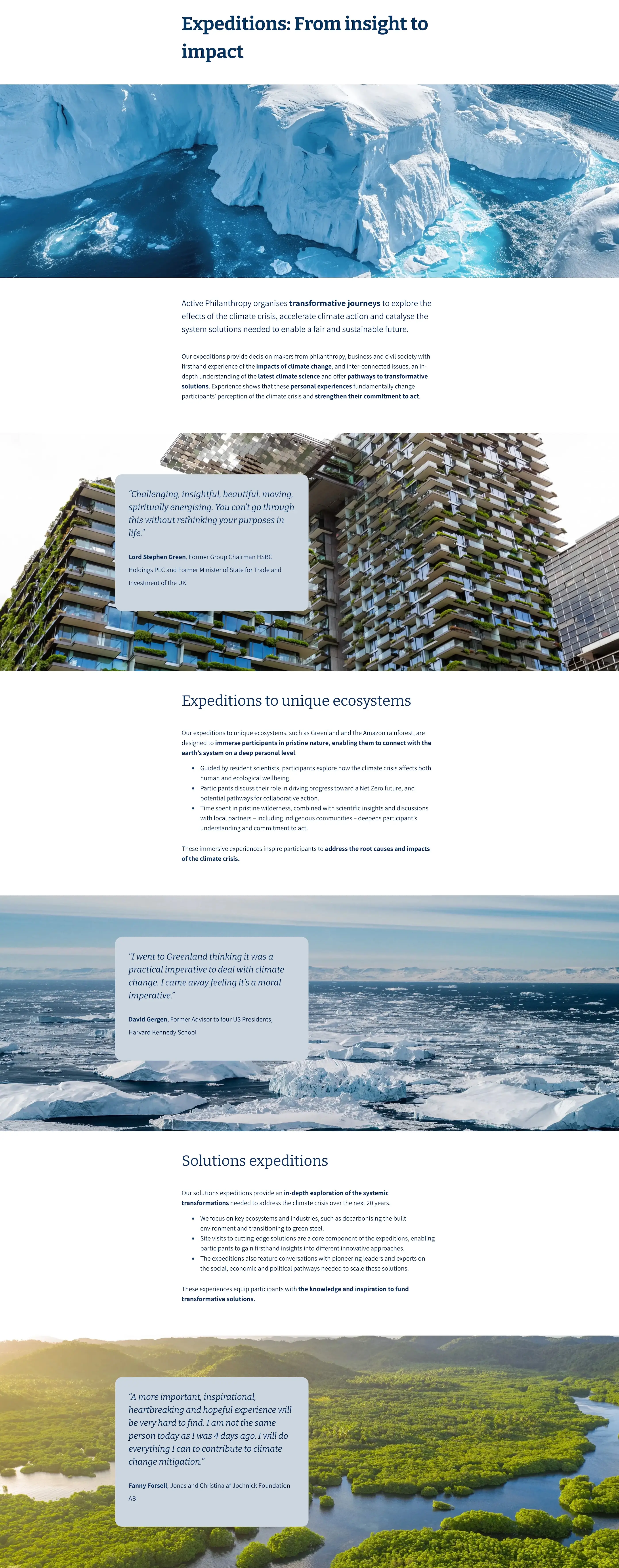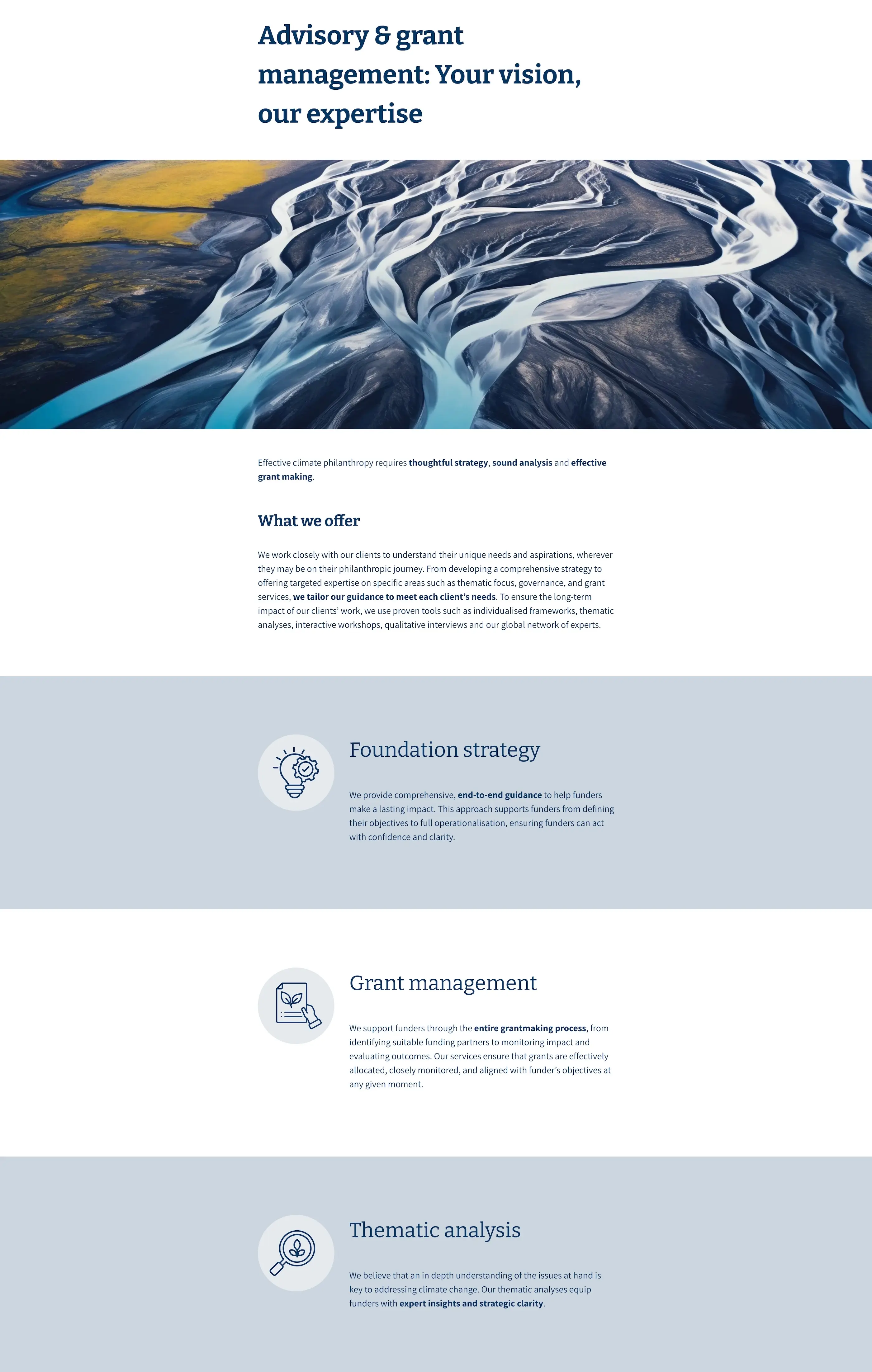 Die Website besticht durch ein luftiges, modernes Design, das die klare Zielsetzung der Organisation visuell unterstreicht. Imposante Bilder und ausdrucksstarke Zitate rahmen die Inhalte. Hilfreiche Ressourcen rund um klimabezogene Philanthropie wurden strukturiert aufbereitet und in ein intuitives Nutzererlebnis eingebettet.