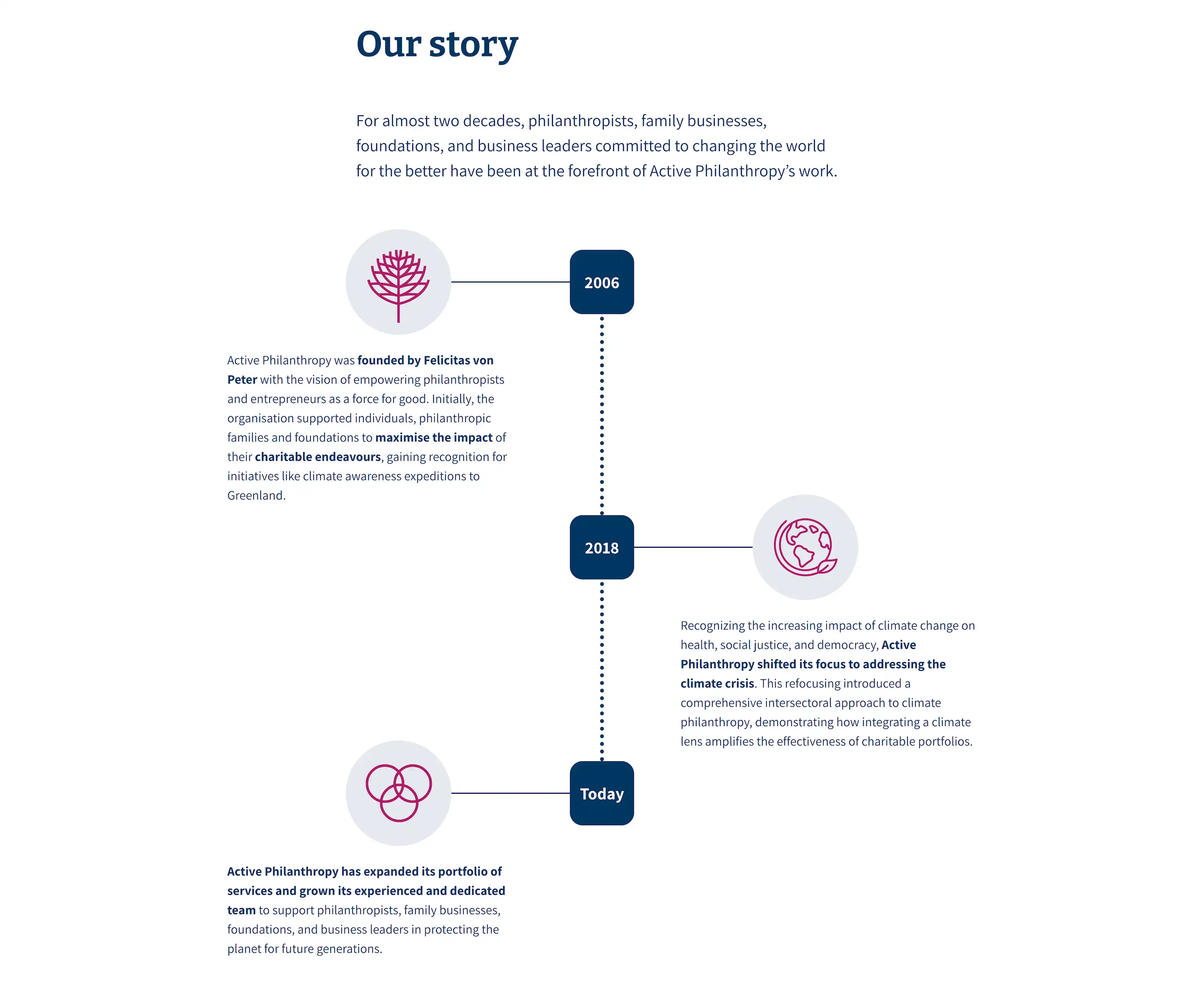 Für den Website-Relaunch durften wir eine digitale Plattform entwickeln, die die Arbeit und Angebote der Organisation klar, prägnant und visuell ansprechend präsentiert. Die neue Seite vermittelt auf den ersten Blick, wofür Active Philanthropy steht – und ermutigt durch gezielte Call-to-Actions, direkt in Kontakt zu treten oder sich tiefer mit dem Thema zu befassen.